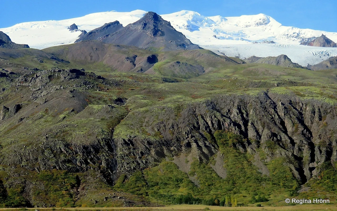 The green and lush Skaftafell appears nestled between massive white glacier tongues on both sides.