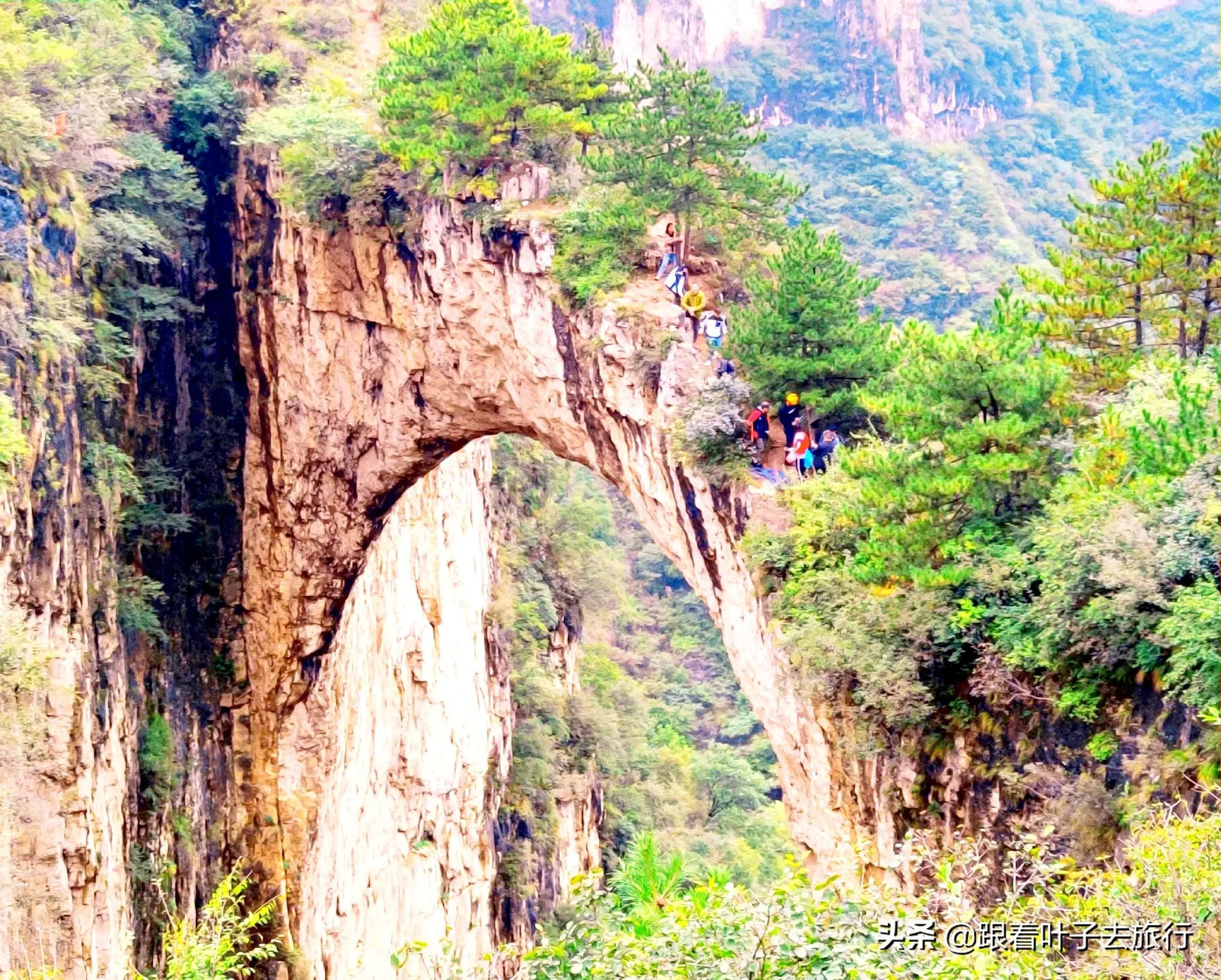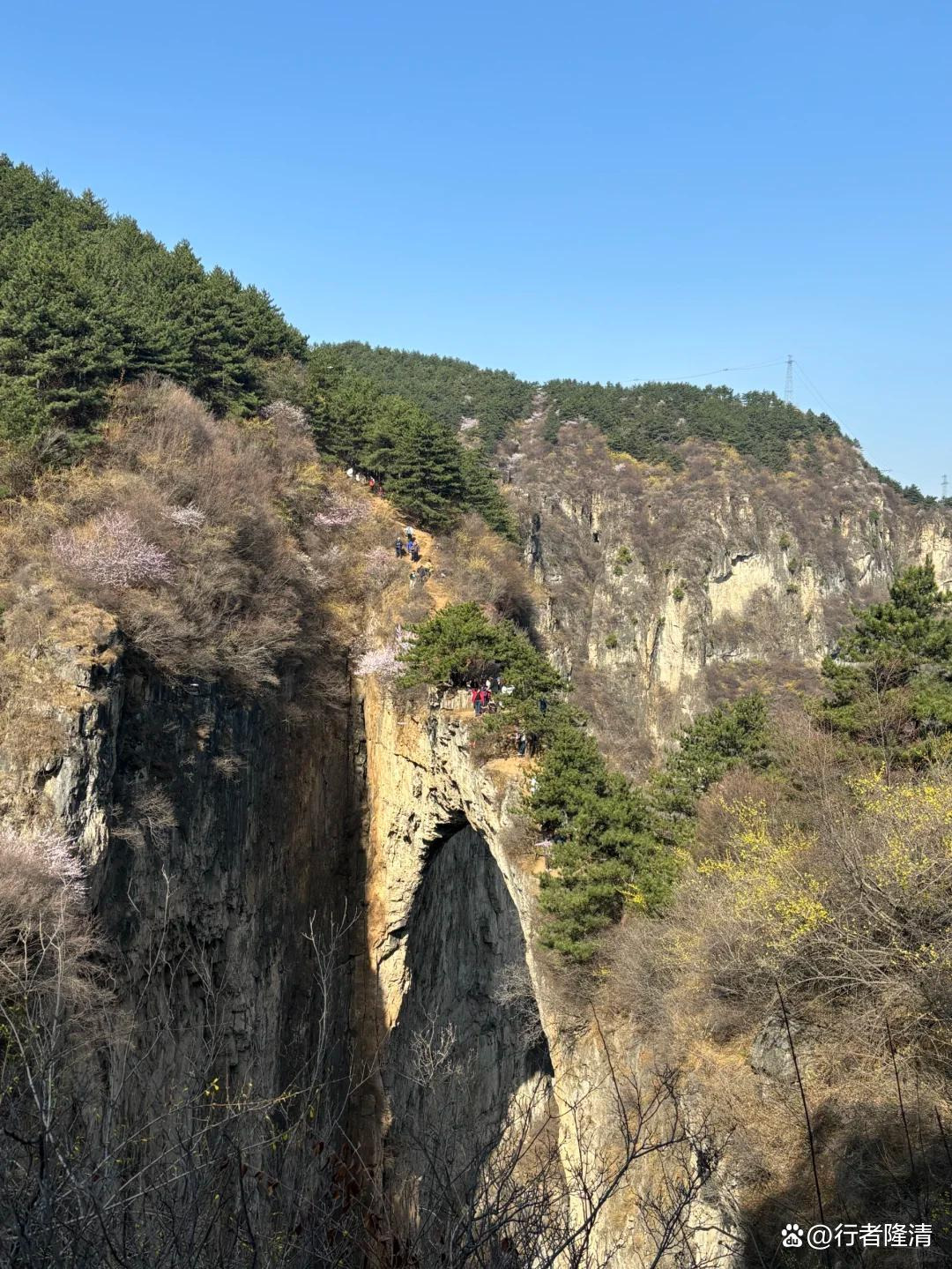 The natural bridge is a natural stone bridge built by unweathered rocks between the steep cliffs. It is also the largest natural bridge found in northern China so far. The bridge has a span of 50 meters and a width of 2-4 meters. The entire bridge arch is also 280 meters high. It can be called a masterpiece of nature.