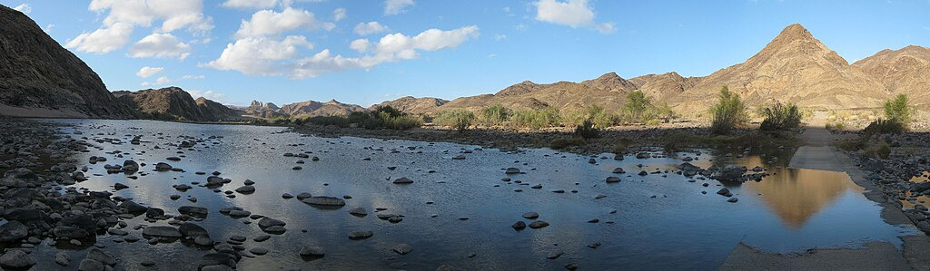 The Fish River is the longest interior river in Namibia. It cuts deep into the plateau which today is dry, stony and sparsely covered with hardy drought-resistant plants. The river flows intermittently, usually flooding in late summer; the rest of the year it becomes a chain of long narrow pools. The hot springs resort of ǀAi-ǀAis is situated at the lower end of the Fish River Canyon.